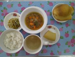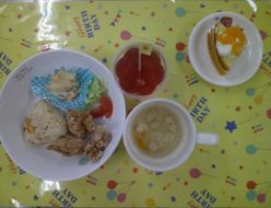 連休は楽しく過ごせましたか?給食は、鶏のさっぱり煮でした。玉ねぎや人参、ピーマンなどをいれました。醤油や砂糖の酢を入れてさっぱり仕上げました。おやつは、ビスキュイパンでした。
