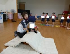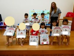 今日は、0・1・2歳児の乳児クラスが熊日童話会に参加しました。絵本の読み聞かせや、ペープサート、手遊びやパネルシアターなど、様々なお話をしてくれました。お話が始まると、集中して絵本を見る子ども達が多くみられました。夏休み中の学童のお友達数名も一緒に参加しました。