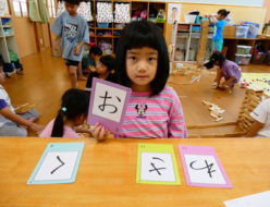 今日は、平仮名のお勉強をしました。初めて「ひらがなカード」を使用しました。「これ、なんて読むか分かる?」「ん~・・・。」と考える子ども達でしたが、自分の名前に入っている平仮名は、少しずつ読めるようになってきました。