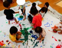 毎日暑い日が続いていますね・・・。そこで、ひよこ🐣・りす🐿組のお友達は、大きな真っ白の紙に、ダイナミックにお絵かきをして遊びました♪初めは、不安と緊張で固まっていた子ども達でしたが、保育者がやってみると「わぁ❣やったー」と大喜び。