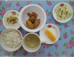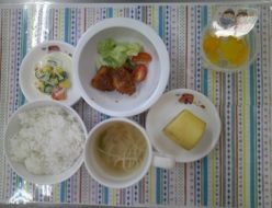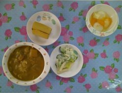 毎日暑い日が続きますね。給食は、夏野菜カレーでした。玉ねぎや人参にナスなどを入れましたよ!おやつは、フルーツ白玉でした。みかんとりんごをいれました。