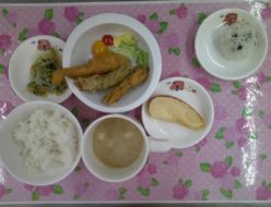 暑い日が続きますね。今日の給食は、ししゃもでした。三色のフリッターにしましたよ!青のりとカレー味を作りました。苦手な子も頑張って食べてくれました😊おやつは、ワカメおにぎりでした。