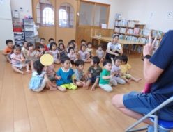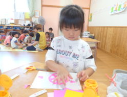 今日は、お盆に向けて提灯作りをしました。提灯の中を、切り紙で作りました。折り紙が折り重なっている為、力を入れて切る事を意識しました。「難しい」という子もいましたが、諦めずに頑張る姿が見られました。一人一人、色んな色の作品が出来上がりました。