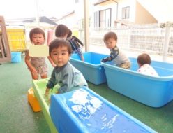 今日も暑かったですね~🥵お休みもなく、全員のお友達が登園してくれたのですが、鼻水が出ている子が多く、水遊びできたのは7人だけでした。いつも玩具で遊び、プールの中に入らない事が多いので、今日はプール3つに水を溜めて遊びました。
