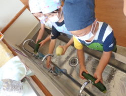 今日は、くま組🐻で育てているズッキーニとトマト🍅を使って、クッキングをしました。朝から収穫もしましたよ🎶初めてのクッキングで、エプロン・三角巾・マスクを喜んで着用していく姿も印象的でしたよ。