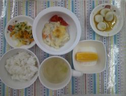 今日も雨☔がひどいときもありましたね。給食は、マカロニグラタンでした。子ども達も好きな子が多く、おかわりもたくさんしてくれました😊おやつは、甘辛団子でした。