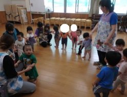 梅雨に入り、毎日ひどい雨☔ですね。今日はひと休みですが、園庭では遊べそうにないので、ランチルームで思いっきり遊びました。♪手をつなごう~ みんなで手をつなごう~と歌いながら、大きな〇になりました。
