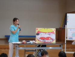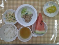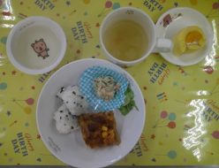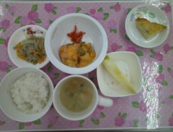今日は、とても暑くなりましたね。給食は、魚の洋風焼きでした。玉葱、ピーマン、コーンをケチャップとマヨネーズ、粉チーズで合わせて魚の上にのせて焼きました。苦手な子も多く、いつもより食べる時間がかかりました。おやつは、バナナケーキでした。