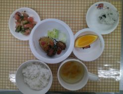 今日は、雨でしたね。今日の給食は、ごぼう、人参、玉葱、豆腐、豚ミンチ、ちりめんじゃこなどを混ぜてからりと揚げました(^^♪ケチャップかけて頂きました☆おやつは、わかめおにぎりでした。