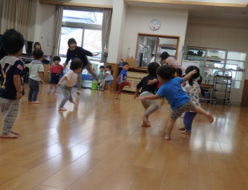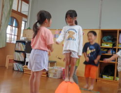 朝から天気が悪く、園庭で遊ぶ事ができず、子ども達はウズウズ・・・。少しでも体を動かせるように、室内で陣取りゲームをしました。バランスストーンから落ちないように気をつけながら、ゲームを楽しむ姿が見られました。