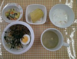今日は、とても天気がいい日でしたね。本日のメニューみんな大好きビビンバ丼でした。みんな沢山食べてくれました。おやつは、フルーツが沢山入ったフルーツヨーグルトおやつも沢山食べてくれました。