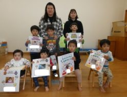 今日は12月生まれのお友だち7名の誕生会を行いました。初めのインタビューでは、少し緊張しながらも堂々と自分の言葉で答える姿が見られ、成長を感じる時間となりました。1つ目の出し物は「ガラガラどん」のパネルシアターです。