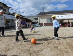 朝のお集まりでは、名前を呼ばれた時の「はーい❣」を毎日練習しています。だんだんと手を挙げてくれるようになりましたよ。歌をうたうと、手をたたいたりペコリとお辞儀をする姿も・・・。とっても可愛いです。おやつを食べた後は、みんなで風船🎈遊びをしました。