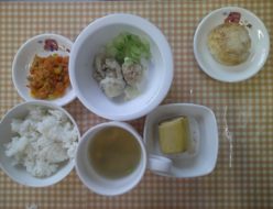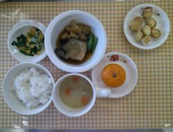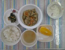 今日は朝、雨が降っていましたね。給食は、ホイコーローでした。キャベツや人参、ピーマンなど味噌や醤油、オイスターソースで味付けしました❣おやつは、フルーツヨーグルトでした。