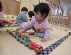 朝のおやつを食べた後は、お部屋でブロック・磁石の積み木を出して遊びました。保育者がカメラ📷を持っていると、「見せて見せて~」と近寄ってきます。ナイススマイル☺の可愛いひよこ組🐣さんです。穴の開いた積み木を目に当てて、「メガネ~👓」と色々な遊びを楽しんでいました。