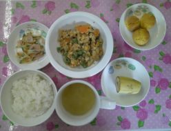 今日も朝は冷え込み寒かったですね。今日の給食は皆大好きな中華丼だったので、沢山おかわりしてくれました。おやつは、園で採れたさつま芋でさつま芋を作りました。