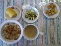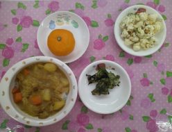 今日も朝は冷え込み寒かったですね。今日の給食は、具材たっぷり入ったのっぺい汁でした。熱々ののっぺい汁は体が温まりましたね(^^♪おやつは、枝豆と鮭フレークが入った🍙でゴマの風味があり美味しかったですね。