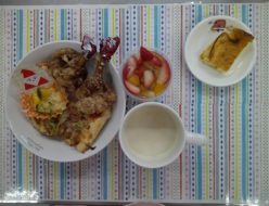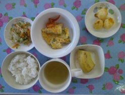 今朝は、とても寒かったですね。給食は、千草焼きでした。玉葱や人参、いんげんなどを卵と合わせて焼き上げました!おやつは、ポンデケージョでした。