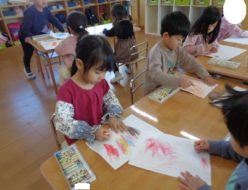 今日は朝から戸外で沢山遊び、朝の体操とマラソン🏃の後には、1人ずつリングジャングルジムに挑戦❣❣自分が出来る所までを見せてくれました。その後、お散歩で集めてきた落ち葉🍂を使って、こすりだし(フロッタージュ)をしてみました。