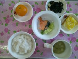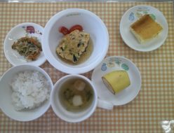 今週も寒くなりそうですね。給食は、擬製豆腐でした。豆腐と小松菜、人参などを卵と合わせて焼き上げました!椎茸の戻し汁で、あんを作ってかけて提供しました。おやつは、オレンジケーキでした。