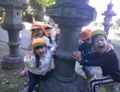 うさぎ組🐇さんときりん組🦒さん合同で、菅原神社まで散歩に行きました。沢山お話をしたり、歌を歌いながら仲良くお散歩しました。神社に着いてからは、綺麗な色の落ち葉🍂で遊んだり、追いかけっこや「だるまさんがころんだ」など、好きな遊びを楽しみました。