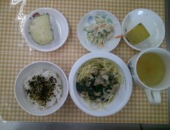 今日、朝は天気が悪かったのですが後から天気も良くなりましたね(^^♪今日の給食は、和風スパゲッティでした。ほうれん草が苦手な子も頑張って完食してくれました。おやつは、久しぶりにチーズいりの蒸しパンでした。