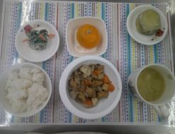 今日は、いいお天気になりましたね。給食は、うま煮でした。大根、人参、里芋などいろいろな具材をいれました!野菜の旨みが出て、おいしく仕上がりました!おやつは、いきなり団子でした。