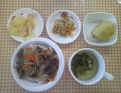 今日も朝は冷え込みましたね。今日の給食は、牛丼と白菜の胡麻和えでした。今日は丼だったので子ども達はご飯がすすんでました(^^♪副菜もぺろりと完食でした。おやつは、ポテトチップスだったので人気でした。