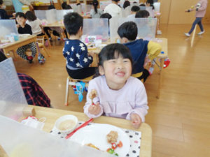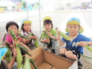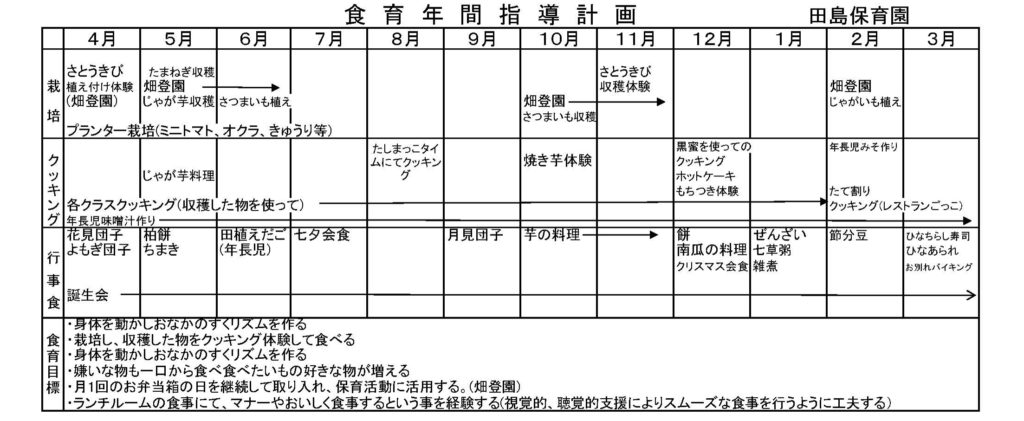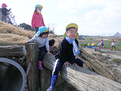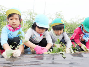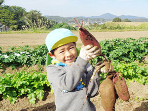 平成28年度より、保護者の方のご協力を頂いて、七城蘇崎のたしまっこ農園へ登園し、広い畑で菜園活動(芋植えから芋掘り、さとうきび植え付けから収穫、黒蜜作りまで等)をしたり、たしまっ子ランドで遊んだりと畑での活動を楽しんでいます。給食もお弁当箱に詰めて、保育園から運んでもらい、畑で食べます。気候のいいときは、畑から保育園まで3,5㎞歩いて帰ってきます。こうして、農業に関わり、自分達が食べているものを知り、体を動かし、お腹を空かせ、自然の中で食する。という農育を保育に取り入れています。