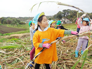 七城にあります畑、たしまっ子こ農園にて、さとうきび栽培を行い、収穫を体験しております。 また、黒砂糖を製造し、給食・おやつに利用しております。 やさしい甘さの美味しい黒砂糖が出来ます。他にも紙すき体験も行います。 畑登園を設け、畑での保育活動を行います。