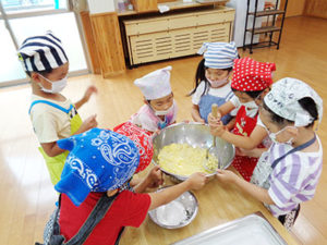 食育として、地域の方々や年長児の子ども達と味噌作りを行い、給食に利用しております。 子ども達はこの手作り味噌の味噌汁が大好きです。月2回年長児によるみそ汁作りを行っています。 食品は発酵することで、もとの素材より栄養価や味の風味が増したり、保存性が高まり、腸内環境を正常化する働きがあります。